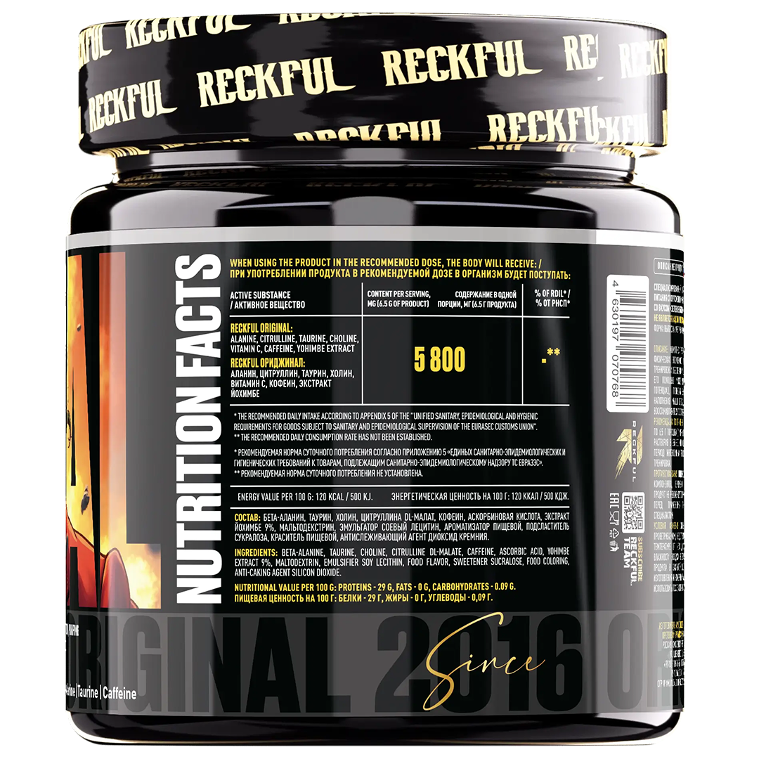 Предтренировочный комплекс «Reckful» Обладая взрывным составом, Reckful позволит вам добиться невероятной эффективности ваших тренировок. Силовые показатели, выносливость и концентрация поднимутся до непривычных высот. Бета-аланин отсрочивает мышечное закисление за счёт выработки карнозина, буфера молочной кислоты. Таурин, выступающий в качестве нейромедиаторной аминокислоты, обеспечивает питание клеток энергией и катализирует действие стимуляционных компонентов комплекса . Цитруллин — донатор оксида азота. Улучшает кровоток в мышцах, снижает утомление и увеличивает эффект «пампа». Кофеин повышает энергетический уровень, усиливает концентрацию и сосредоточенность. Reckful рекомендуется применять за 20-40 минут до тренировки. Также, мы советуем начинать с 1/2 порции и с опытом постепенно увеличивать до полноценной ложки, во избежание индивидуальной передозировки.
